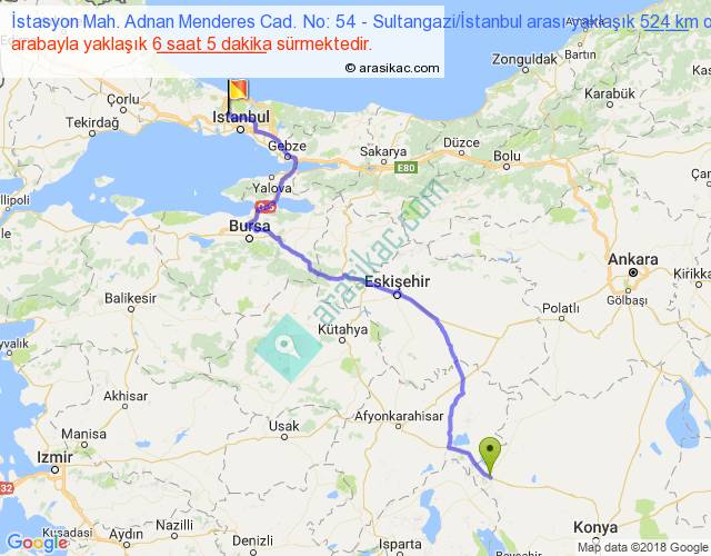 İstasyon Mah. Adnan Menderes Cad. No: 54 - Sultangazi İstanbul arası yaklaşık olarak 90 km/h ile yukarıda belirtilen sürede olup, iki yerin kuş uçuşu uzaklığı (mesafesi) 375'dir. Eğer belirtilen yerler arasında uçak seferi var ise bu süre uçakla 34 dakika'ya kadar düşebilir. Yolculuk otobüsle 7 saat 54 dakika sürmektedir.