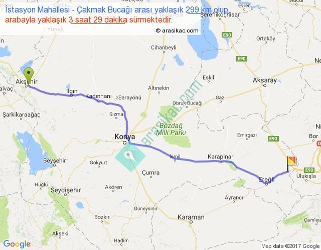 İstasyon Mahallesi - Çakmak Bucağı arası yaklaşık olarak 90 km/h ile yukarıda belirtilen sürede olup, iki yerin kuş uçuşu uzaklığı (mesafesi) 261'dir. Eğer belirtilen yerler arasında uçak seferi var ise bu süre uçakla 24 dakika'ya kadar düşebilir. Yolculuk otobüsle 4 saat 31 dakika sürmektedir.