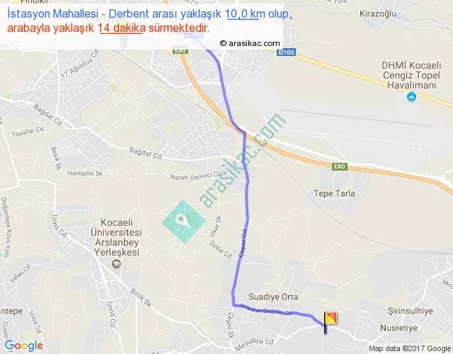 İstasyon Mahallesi - Derbent arası yaklaşık olarak 90 km/h ile yukarıda belirtilen sürede olup, iki yerin kuş uçuşu uzaklığı (mesafesi) 7'dir. Yolculuk otobüsle 18 dakika sürmektedir.