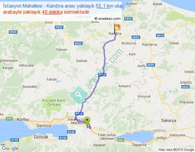 İstasyon Mahallesi - Kandıra arası yaklaşık olarak 90 km/h ile yukarıda belirtilen sürede olup, iki yerin kuş uçuşu uzaklığı (mesafesi) 37'dir. Yolculuk otobüsle 59 dakika sürmektedir.