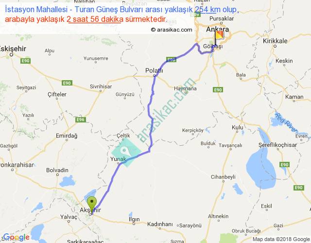İstasyon Mahallesi - Turan Güneş Bulvarı arası yaklaşık olarak 90 km/h ile yukarıda belirtilen sürede olup, iki yerin kuş uçuşu uzaklığı (mesafesi) 203'dir. Yolculuk otobüsle 3 saat 48 dakika sürmektedir.