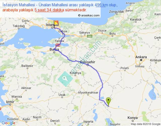 İstasyon Mahallesi - Ünalan Mahallesi arası yaklaşık olarak 90 km/h ile yukarıda belirtilen sürede olup, iki yerin kuş uçuşu uzaklığı (mesafesi) 354'dir. Eğer belirtilen yerler arasında uçak seferi var ise bu süre uçakla 32 dakika'ya kadar düşebilir. Yolculuk otobüsle 7 saat 14 dakika sürmektedir.