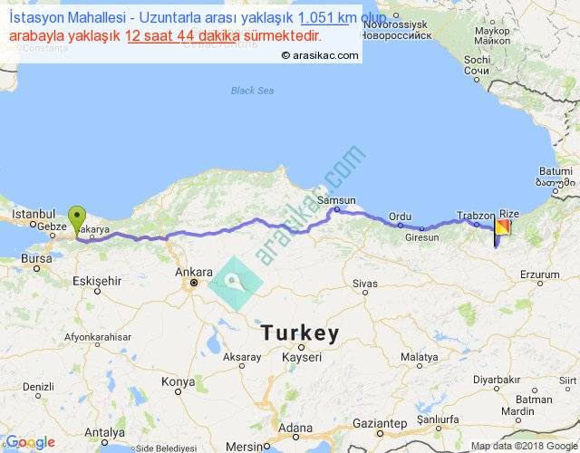 İstasyon Mahallesi - Uzuntarla arası yaklaşık olarak 90 km/h ile yukarıda belirtilen sürede olup, iki yerin kuş uçuşu uzaklığı (mesafesi) 851'dir. Eğer belirtilen yerler arasında uçak seferi var ise bu süre uçakla 1 saat 18 dakika'ya kadar düşebilir. Yolculuk otobüsle 16 saat 33 dakika sürmektedir.