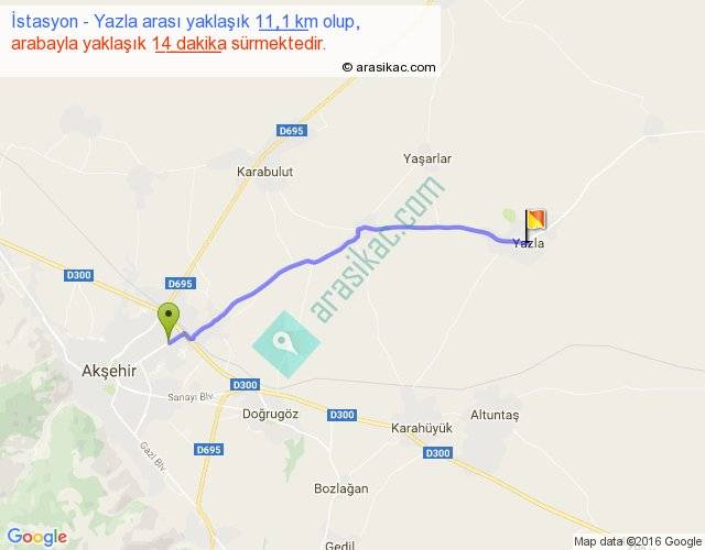 İstasyon - Yazla arası yaklaşık olarak 90 km/h ile yukarıda belirtilen sürede olup, iki yerin kuş uçuşu uzaklığı (mesafesi) 10'dir. Yolculuk otobüsle 18 dakika sürmektedir.