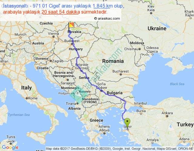 İstasyonaltı - 971 01 Cigeľ arası yaklaşık olarak 90 km/h ile yukarıda belirtilen sürede olup, iki yerin kuş uçuşu uzaklığı (mesafesi) 1314'dir. Eğer belirtilen yerler arasında uçak seferi var ise bu süre uçakla 2 saat 01 dakika'ya kadar düşebilir. Yolculuk otobüsle 1 gün 3 saat sürmektedir.