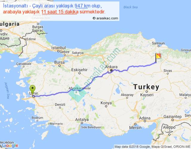İstasyonaltı - Çaylı arası yaklaşık olarak 90 km/h ile yukarıda belirtilen sürede olup, iki yerin kuş uçuşu uzaklığı (mesafesi) 804'dir. Eğer belirtilen yerler arasında uçak seferi var ise bu süre uçakla 1 saat 14 dakika'ya kadar düşebilir. Yolculuk otobüsle 14 saat 37 dakika sürmektedir.