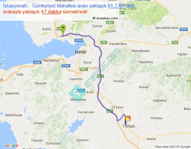 İstasyonaltı - Cumhuriyet Mahallesi arası yaklaşık olarak 90 km/h ile yukarıda belirtilen sürede olup, iki yerin kuş uçuşu uzaklığı (mesafesi) 44'dir. Yolculuk otobüsle 1 saat 1 dakika sürmektedir.