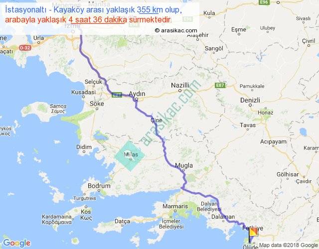İstasyonaltı - Kayaköy arası yaklaşık olarak 90 km/h ile yukarıda belirtilen sürede olup, iki yerin kuş uçuşu uzaklığı (mesafesi) 276'dir. Eğer belirtilen yerler arasında uçak seferi var ise bu süre uçakla 25 dakika'ya kadar düşebilir. Yolculuk otobüsle 5 saat 58 dakika sürmektedir.