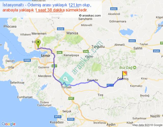 İstasyonaltı - Ödemiş arası yaklaşık olarak 90 km/h ile yukarıda belirtilen sürede olup, iki yerin kuş uçuşu uzaklığı (mesafesi) 84'dir. Yolculuk otobüsle 2 saat 7 dakika sürmektedir.