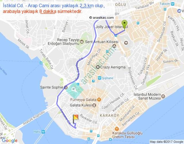 İstiklal Cd. - Arap Cami arası yaklaşık olarak 90 km/h ile yukarıda belirtilen sürede olup, iki yerin kuş uçuşu uzaklığı (mesafesi) 1'dir. Yolculuk otobüsle 10 dakika sürmektedir.