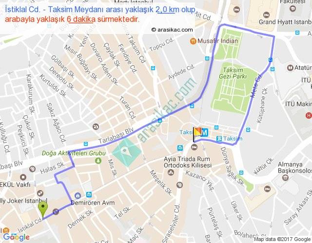 İstiklal Cd. - Taksim Meydanı arası yaklaşık olarak 90 km/h ile yukarıda belirtilen sürede olup, iki yerin kuş uçuşu uzaklığı (mesafesi) 1'dir. Yolculuk otobüsle 7 dakika sürmektedir.