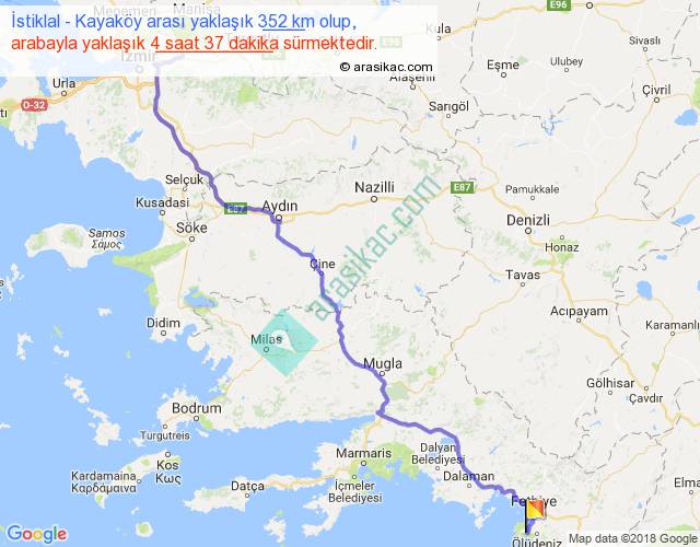 İstiklal - Kayaköy arası yaklaşık olarak 90 km/h ile yukarıda belirtilen sürede olup, iki yerin kuş uçuşu uzaklığı (mesafesi) 259'dir. Eğer belirtilen yerler arasında uçak seferi var ise bu süre uçakla 23 dakika'ya kadar düşebilir. Yolculuk otobüsle 6 saat 0 dakika sürmektedir.