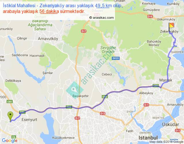 İstiklal Mahallesi - Zekeriyaköy arası yaklaşık olarak 90 km/h ile yukarıda belirtilen sürede olup, iki yerin kuş uçuşu uzaklığı (mesafesi) 36'dir. Yolculuk otobüsle 1 saat 12 dakika sürmektedir.