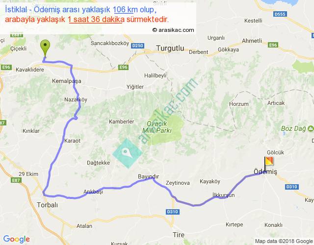 İstiklal - Ödemiş arası yaklaşık olarak 90 km/h ile yukarıda belirtilen sürede olup, iki yerin kuş uçuşu uzaklığı (mesafesi) 60'dir. Yolculuk otobüsle 2 saat 4 dakika sürmektedir.