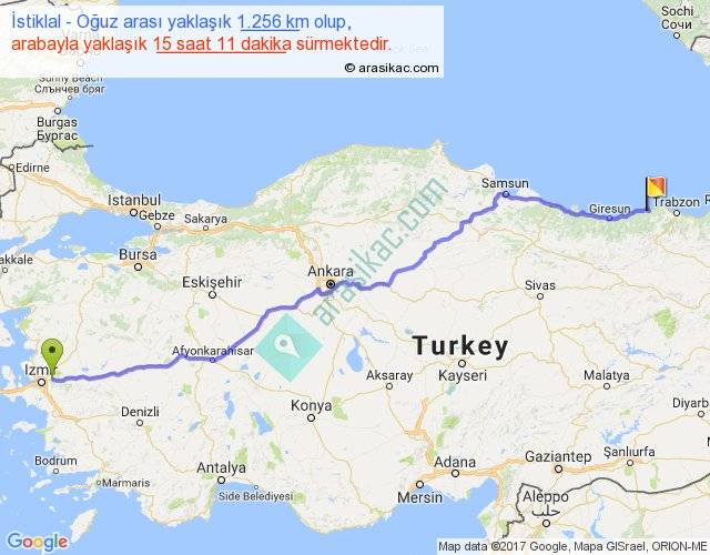 İstiklal - Oğuz arası yaklaşık olarak 90 km/h ile yukarıda belirtilen sürede olup, iki yerin kuş uçuşu uzaklığı (mesafesi) 1041'dir. Eğer belirtilen yerler arasında uçak seferi var ise bu süre uçakla 1 saat 36 dakika'ya kadar düşebilir. Yolculuk otobüsle 19 saat 44 dakika sürmektedir.
