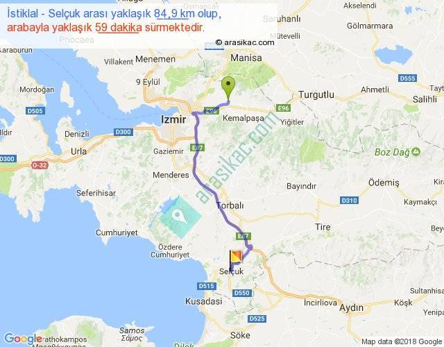 İstiklal - Selçuk arası yaklaşık olarak 90 km/h ile yukarıda belirtilen sürede olup, iki yerin kuş uçuşu uzaklığı (mesafesi) 58'dir. Yolculuk otobüsle 1 saat 16 dakika sürmektedir.