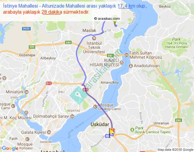 İstinye Mahallesi - Altunizade Mahallesi arası yaklaşık olarak 90 km/h ile yukarıda belirtilen sürede olup, iki yerin kuş uçuşu uzaklığı (mesafesi) 11'dir. Yolculuk otobüsle 36 dakika sürmektedir.