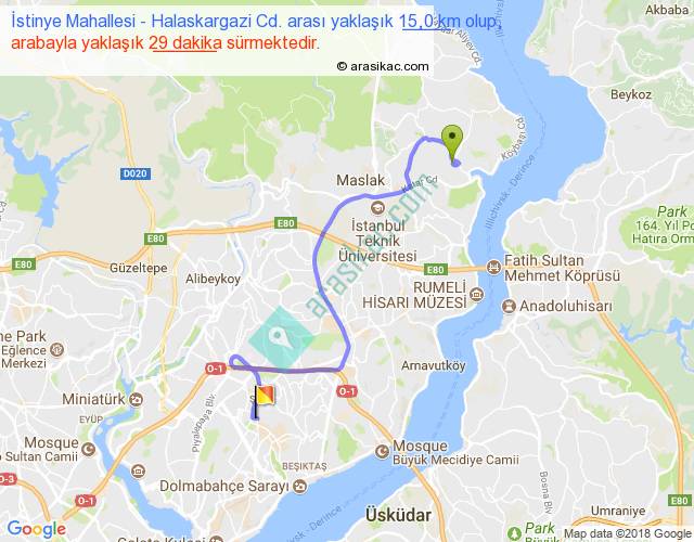 İstinye Mahallesi - Halaskargazi Cd. arası yaklaşık olarak 90 km/h ile yukarıda belirtilen sürede olup, iki yerin kuş uçuşu uzaklığı (mesafesi) 8'dir. Yolculuk otobüsle 37 dakika sürmektedir.