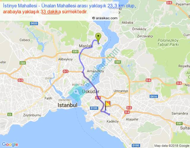İstinye Mahallesi - Ünalan Mahallesi arası yaklaşık olarak 90 km/h ile yukarıda belirtilen sürede olup, iki yerin kuş uçuşu uzaklığı (mesafesi) 13'dir. Yolculuk otobüsle 42 dakika sürmektedir.