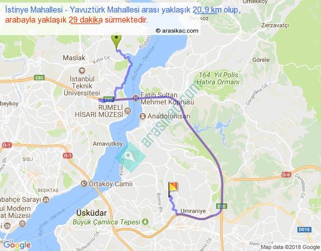 İstinye Mahallesi - Yavuztürk Mahallesi arası yaklaşık olarak 90 km/h ile yukarıda belirtilen sürede olup, iki yerin kuş uçuşu uzaklığı (mesafesi) 9'dir. Yolculuk otobüsle 37 dakika sürmektedir.