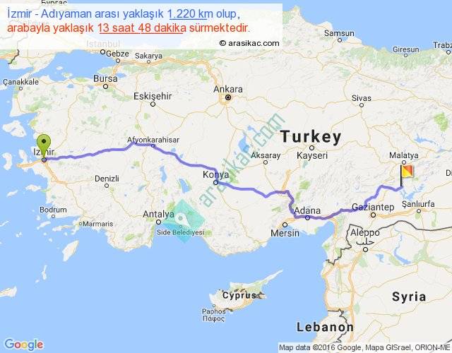 İzmir - Adıyaman arası yaklaşık olarak 90 km/h ile yukarıda belirtilen sürede olup, iki yerin kuş uçuşu uzaklığı (mesafesi) 971'dir. Eğer belirtilen yerler arasında uçak seferi var ise bu süre uçakla 1 saat 29 dakika'ya kadar düşebilir. Yolculuk otobüsle 17 saat 56 dakika sürmektedir.