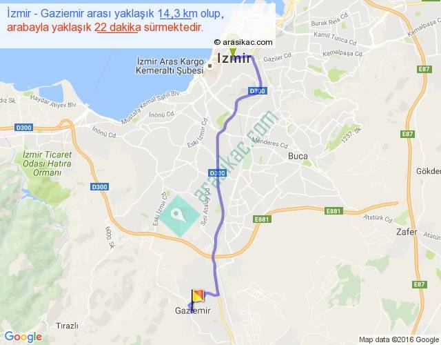 İzmir - Gaziemir arası yaklaşık olarak 90 km/h ile yukarıda belirtilen sürede olup, iki yerin kuş uçuşu uzaklığı (mesafesi) 11'dir. Yolculuk otobüsle 28 dakika sürmektedir.