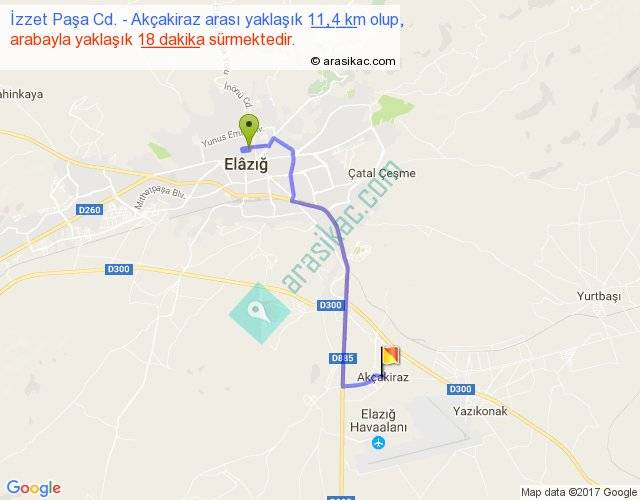 İzzet Paşa Cd. - Akçakiraz arası yaklaşık olarak 90 km/h ile yukarıda belirtilen sürede olup, iki yerin kuş uçuşu uzaklığı (mesafesi) 8'dir. Yolculuk otobüsle 23 dakika sürmektedir.