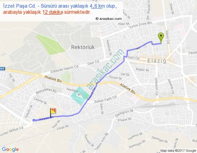 İzzet Paşa Cd. - Sürsürü arası yaklaşık olarak 90 km/h ile yukarıda belirtilen sürede olup, iki yerin kuş uçuşu uzaklığı (mesafesi) 3'dir. Yolculuk otobüsle 15 dakika sürmektedir.