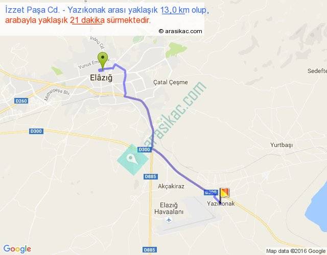 İzzet Paşa Cd. - Yazıkonak arası yaklaşık olarak 90 km/h ile yukarıda belirtilen sürede olup, iki yerin kuş uçuşu uzaklığı (mesafesi) 10'dir. Yolculuk otobüsle 27 dakika sürmektedir.