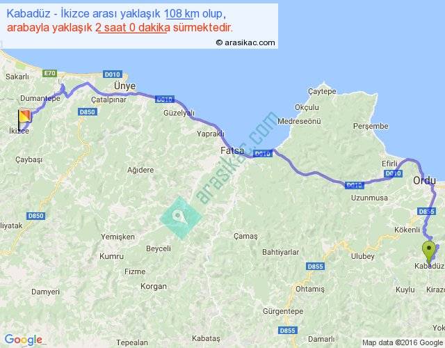 Kabadüz - İkizce arası yaklaşık olarak 90 km/h ile yukarıda belirtilen sürede olup, iki yerin kuş uçuşu uzaklığı (mesafesi) 71'dir. Yolculuk otobüsle 2 saat 36 dakika sürmektedir.