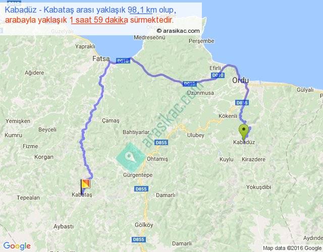 Kabadüz - Kabataş arası yaklaşık olarak 90 km/h ile yukarıda belirtilen sürede olup, iki yerin kuş uçuşu uzaklığı (mesafesi) 39'dir. Yolculuk otobüsle 2 saat 34 dakika sürmektedir.
