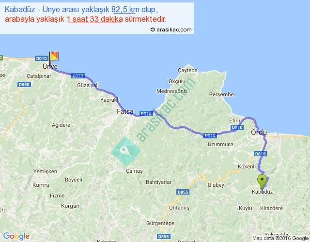 Kabadüz - Ünye arası yaklaşık olarak 90 km/h ile yukarıda belirtilen sürede olup, iki yerin kuş uçuşu uzaklığı (mesafesi) 58'dir. Yolculuk otobüsle 2 saat 0 dakika sürmektedir.