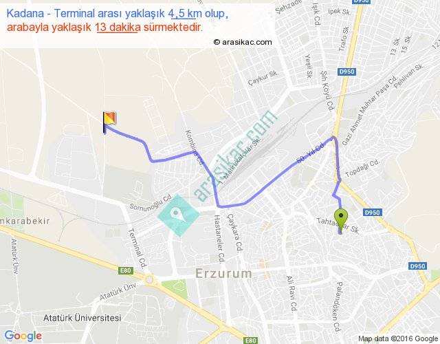 Kadana - Terminal arası yaklaşık olarak 90 km/h ile yukarıda belirtilen sürede olup, iki yerin kuş uçuşu uzaklığı (mesafesi) 3'dir. Yolculuk otobüsle 16 dakika sürmektedir.