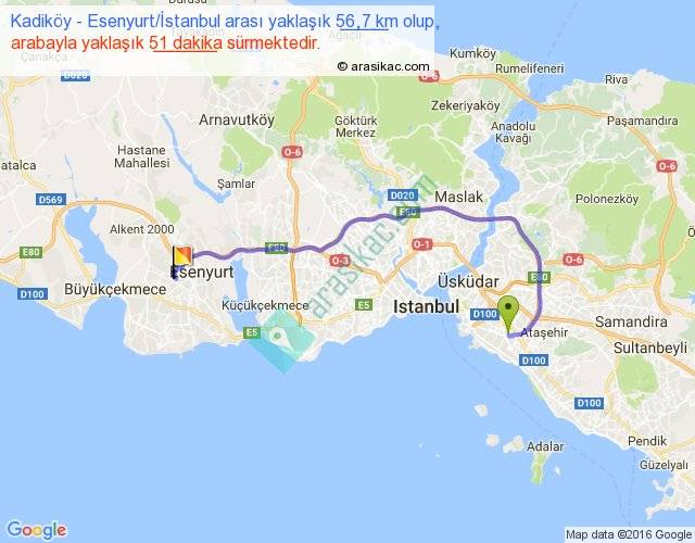 Kadiköy - Esenyurt İstanbul arası yaklaşık olarak 90 km/h ile yukarıda belirtilen sürede olup, iki yerin kuş uçuşu uzaklığı (mesafesi) 36'dir. Yolculuk otobüsle 1 saat 6 dakika sürmektedir.