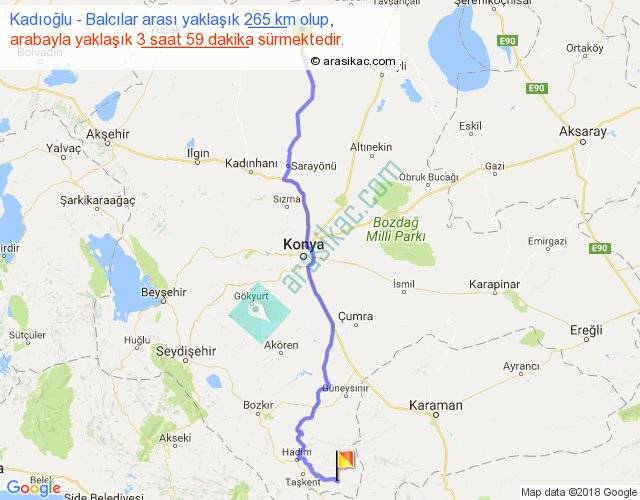 Kadıoğlu - Balcılar arası yaklaşık olarak 90 km/h ile yukarıda belirtilen sürede olup, iki yerin kuş uçuşu uzaklığı (mesafesi) 205'dir. Yolculuk otobüsle 5 saat 10 dakika sürmektedir.