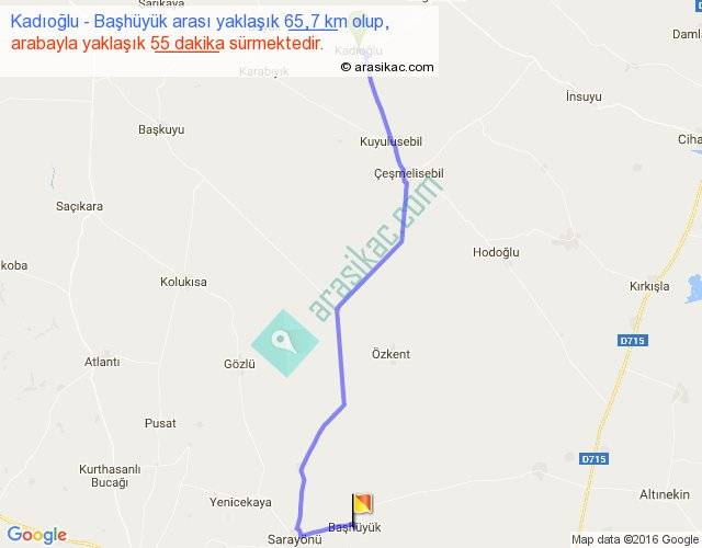 Kadıoğlu - Başhüyük arası yaklaşık olarak 90 km/h ile yukarıda belirtilen sürede olup, iki yerin kuş uçuşu uzaklığı (mesafesi) 52'dir. Yolculuk otobüsle 1 saat 11 dakika sürmektedir.