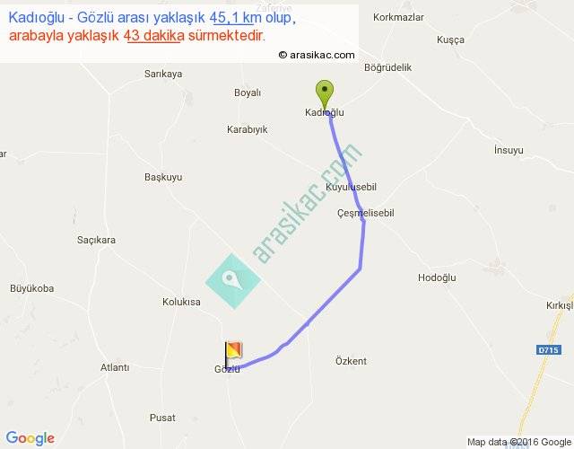 Kadıoğlu - Gözlü arası yaklaşık olarak 90 km/h ile yukarıda belirtilen sürede olup, iki yerin kuş uçuşu uzaklığı (mesafesi) 36'dir. Yolculuk otobüsle 55 dakika sürmektedir.