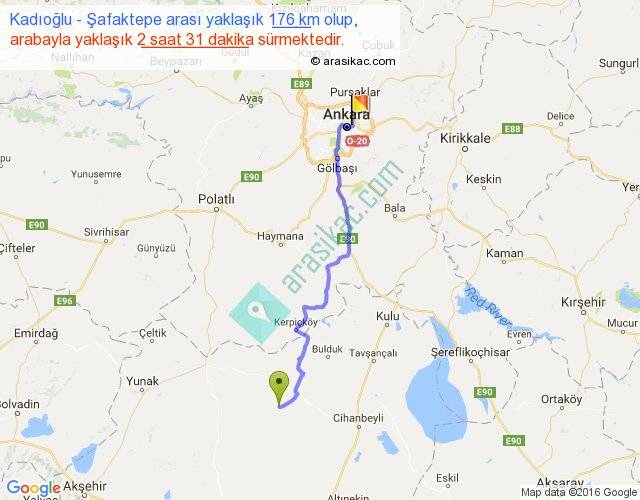 Kadıoğlu - Şafaktepe arası yaklaşık olarak 90 km/h ile yukarıda belirtilen sürede olup, iki yerin kuş uçuşu uzaklığı (mesafesi) 136'dir. Yolculuk otobüsle 3 saat 16 dakika sürmektedir.