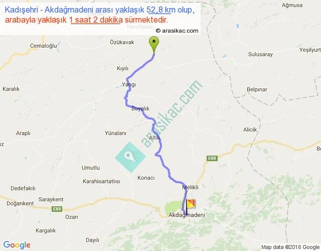 Kadışehri - Akdağmadeni arası yaklaşık olarak 90 km/h ile yukarıda belirtilen sürede olup, iki yerin kuş uçuşu uzaklığı (mesafesi) 38'dir. Yolculuk otobüsle 1 saat 20 dakika sürmektedir.