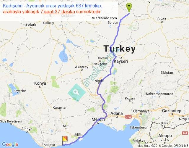 Kadışehri - Aydıncık arası yaklaşık olarak 90 km/h ile yukarıda belirtilen sürede olup, iki yerin kuş uçuşu uzaklığı (mesafesi) 477'dir. Eğer belirtilen yerler arasında uçak seferi var ise bu süre uçakla 44 dakika'ya kadar düşebilir. Yolculuk otobüsle 9 saat 54 dakika sürmektedir.