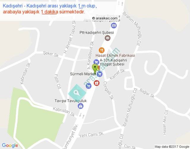 Kadışehri - Kadışehri arası yaklaşık olarak 90 km/h ile yukarıda belirtilen sürede olup, iki yerin kuş uçuşu uzaklığı (mesafesi) 0'dir. Yolculuk otobüsle 1 dakika sürmektedir.