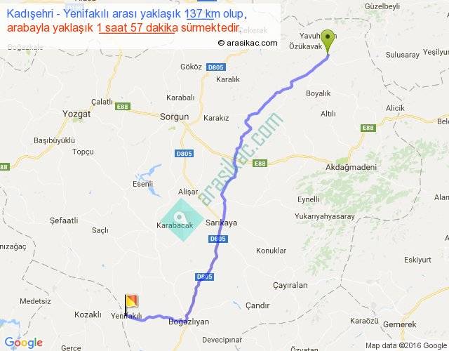 Kadışehri - Yenifakılı arası yaklaşık olarak 90 km/h ile yukarıda belirtilen sürede olup, iki yerin kuş uçuşu uzaklığı (mesafesi) 110'dir. Yolculuk otobüsle 2 saat 32 dakika sürmektedir.