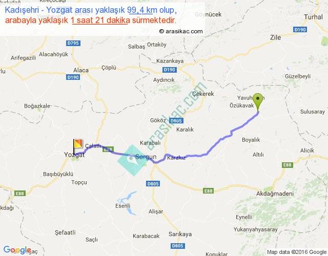 Kadışehri - Yozgat arası yaklaşık olarak 90 km/h ile yukarıda belirtilen sürede olup, iki yerin kuş uçuşu uzaklığı (mesafesi) 86'dir. Yolculuk otobüsle 1 saat 45 dakika sürmektedir.