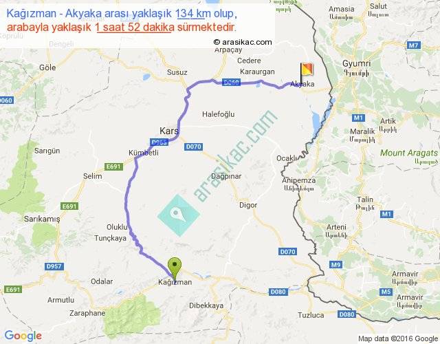 Kağızman - Akyaka arası yaklaşık olarak 90 km/h ile yukarıda belirtilen sürede olup, iki yerin kuş uçuşu uzaklığı (mesafesi) 79'dir. Yolculuk otobüsle 2 saat 25 dakika sürmektedir.