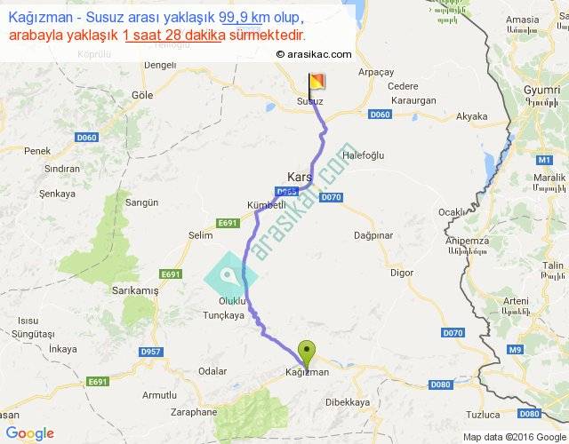 Kağızman - Susuz arası yaklaşık olarak 90 km/h ile yukarıda belirtilen sürede olup, iki yerin kuş uçuşu uzaklığı (mesafesi) 71'dir. Yolculuk otobüsle 1 saat 54 dakika sürmektedir.