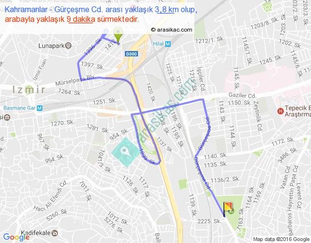 Kahramanlar - Gürçeşme Cd. arası yaklaşık olarak 90 km/h ile yukarıda belirtilen sürede olup, iki yerin kuş uçuşu uzaklığı (mesafesi) 2'dir. Yolculuk otobüsle 11 dakika sürmektedir.
