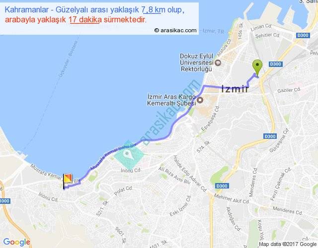 Kahramanlar - Güzelyalı arası yaklaşık olarak 90 km/h ile yukarıda belirtilen sürede olup, iki yerin kuş uçuşu uzaklığı (mesafesi) 7'dir. Yolculuk otobüsle 22 dakika sürmektedir.
