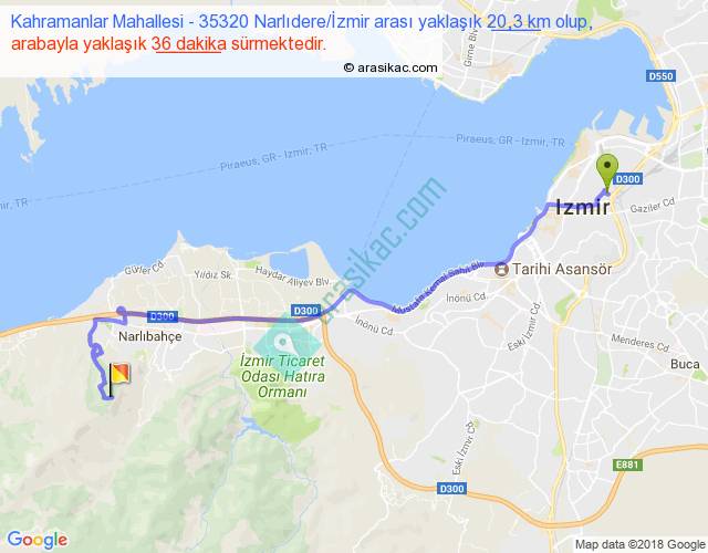 Kahramanlar Mahallesi - 35320 Narlıdere İzmir arası yaklaşık olarak 90 km/h ile yukarıda belirtilen sürede olup, iki yerin kuş uçuşu uzaklığı (mesafesi) 14'dir. Yolculuk otobüsle 46 dakika sürmektedir.