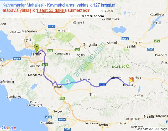 Kahramanlar Mahallesi - Kaymakçi arası yaklaşık olarak 90 km/h ile yukarıda belirtilen sürede olup, iki yerin kuş uçuşu uzaklığı (mesafesi) 89'dir. Yolculuk otobüsle 2 saat 26 dakika sürmektedir.