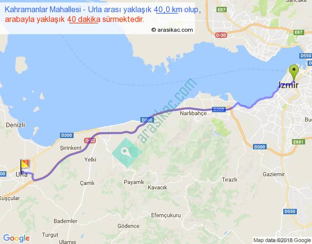 Kahramanlar Mahallesi - Urla arası yaklaşık olarak 90 km/h ile yukarıda belirtilen sürede olup, iki yerin kuş uçuşu uzaklığı (mesafesi) 35'dir. Yolculuk otobüsle 52 dakika sürmektedir.